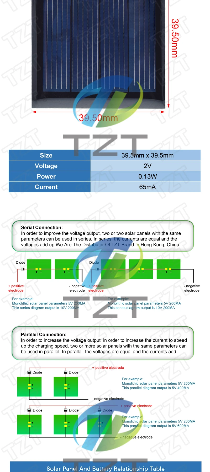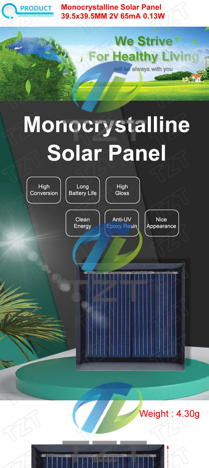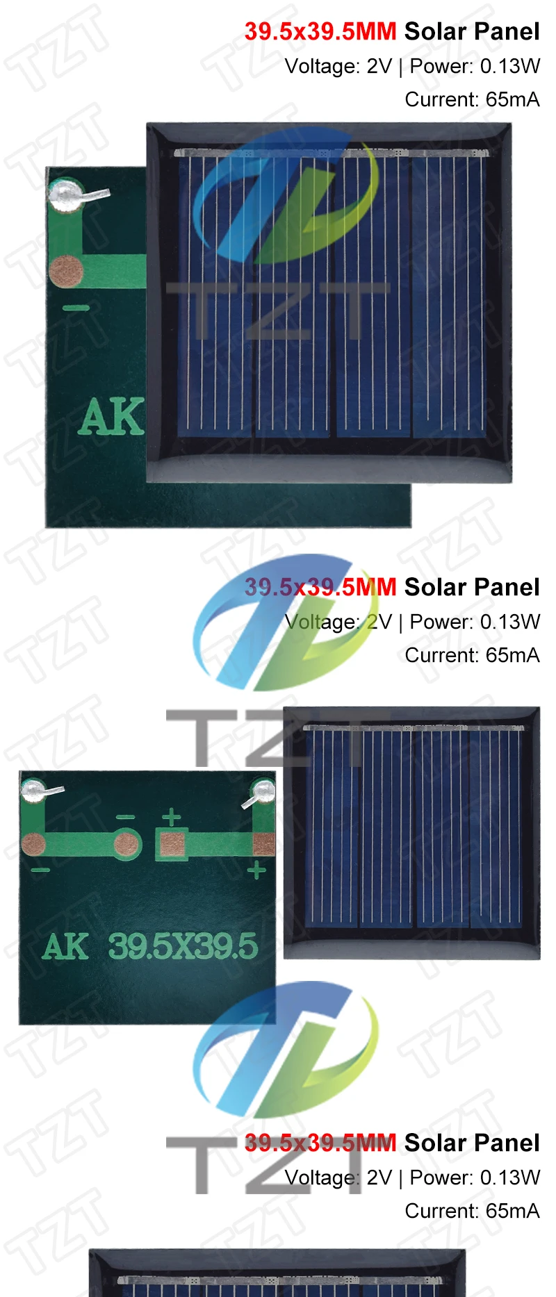 TZT 2V 65mA 0.13W Solar Panel Epoxy Polycrystalline DIY Toy Solar Light Battery Power Charge Module 39.5*39.5MM Mini Solar Cell2 € 9844 in stock - TZT 2V 65mA 0.13W Solar Panel Epoxy Polycrystalline DIY Toy Solar Light Battery Power Charge Module 39.5*39.5MM Mini Solar Cell quantity + Add to cart SKU: 1005004684031600 Category: category1 Description Reviews (0) Description Brand Name: TZT Origin: Mainland China Certification: None Model Number: 2V 60mA 0.13W Solar Panel Reviews There are no reviews yet. Be the first to review “TZT 2V 65mA 0.13W Solar Panel Epoxy Polycrystalline DIY Toy Solar Light Battery Power Charge Module 39.5*39.5MM Mini Solar Cell” Cancel replyYour email address will not be published. Required fields are marked *Your rating * Rate… Perfect Good Average Not that bad Very poor Your review *Name * Email * Save my name, email, and website in this browser for the next time I comment. Related products 5W 18V DC Output Monocrystalline Solar Panel Charger With Car Cigarette Lighter Plug Battery Charging Alligator Clip Cable 5W 32 € Select options This product has multiple variants. The options may be chosen on the product page 80W Foldable Solar Panel Kit 18V USB Charging Solar Cell Board Controller Portable Waterproof Solar For Phone RV Car MP3 82 € Add to cart Solar Battery Charger 1.8W 5V Output USB Female Port 5V 360mA Charge Regulators Solar Panel Travel Powerbank for Smartphone 15 € Add to cart 300W 240W 180W 120W Foldable Solar Panel Monocrystalline 12V Portable Solar Panel Kit For Powerbank/Camping/Boat/Car 464 € – 882 €Price range: 464 € through 882 € Select options This product has multiple variants. The options may be chosen on the product page